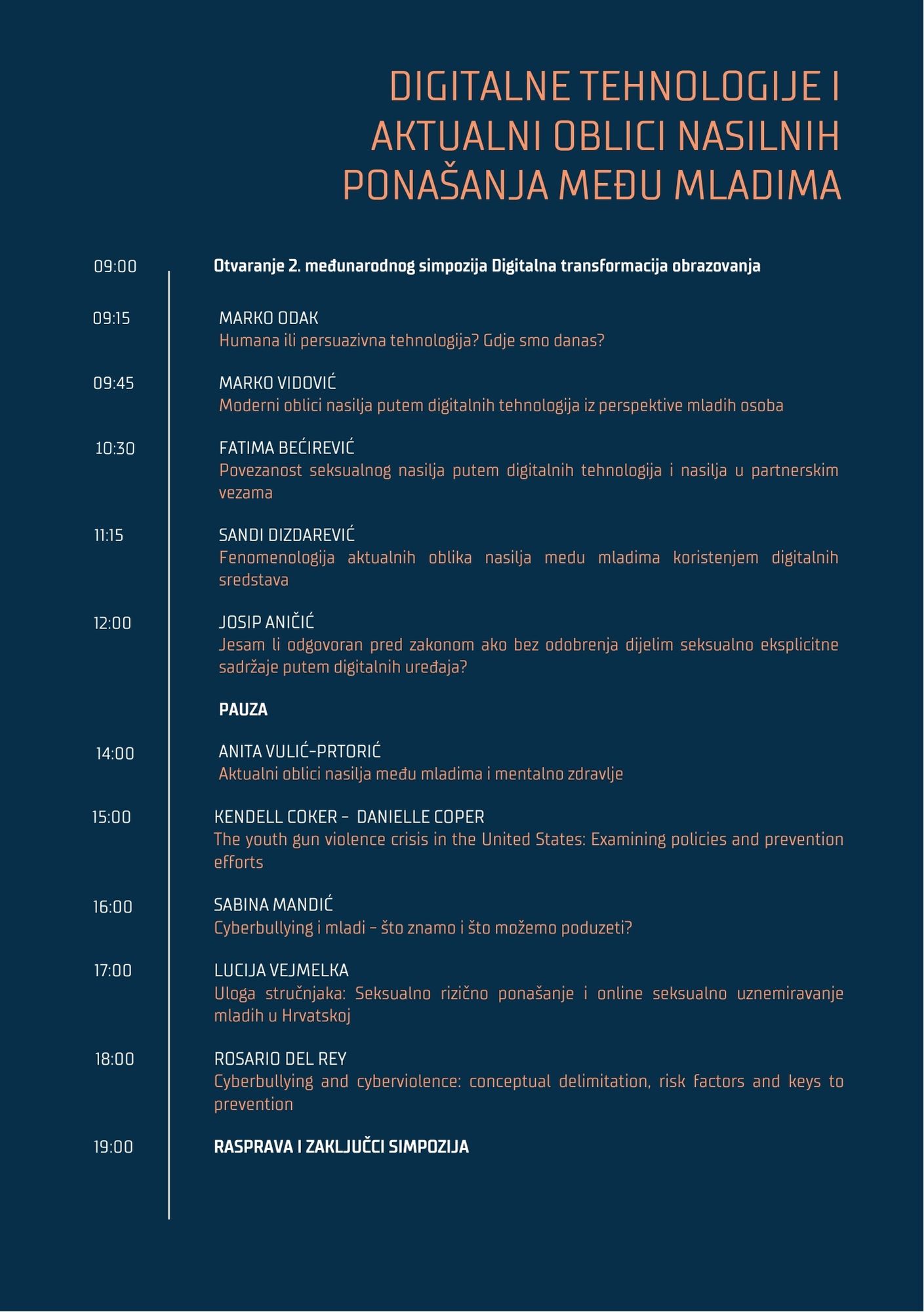 Cilj ovogodišnjeg simpozija je pružiti detaljnije razumijevanje suvremenih izazova aktualnih oblika nasilja među mladima s posebnim osvrtom na utjecaj digitalne tehnologije te predstaviti najnovije trendove i praksu u prevenciji kako bismo informirali i osnažili stručnjake u radu s mladima.