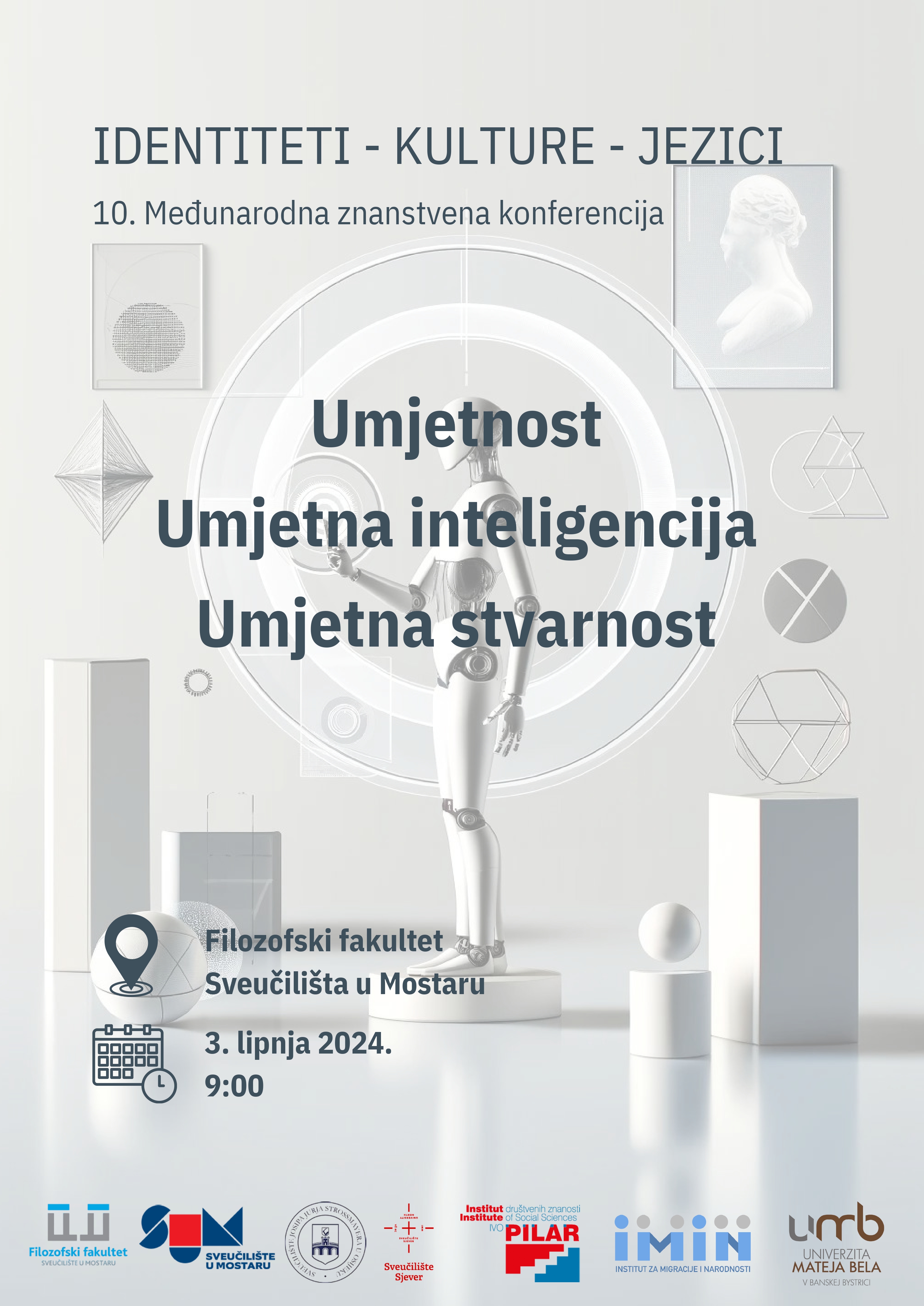 Na Filozofskom fakultetu Sveučilišta u Mostaru već desetu godinu za redom organizira se međunarodna znanstvena konferencija Identiteti – kulture – jezici s ciljem poticanja i uključivanja zainteresiranih stručnjaka iz šireg spektra znanstveno-studijskih disciplina.  Deseta po redu konferencija nosi naziv Umjetnost – Umjetna inteligencija – Umjetna stvarnost, a održat će se 3. lipnja 2024. godine s početkom u 9.00 sati.