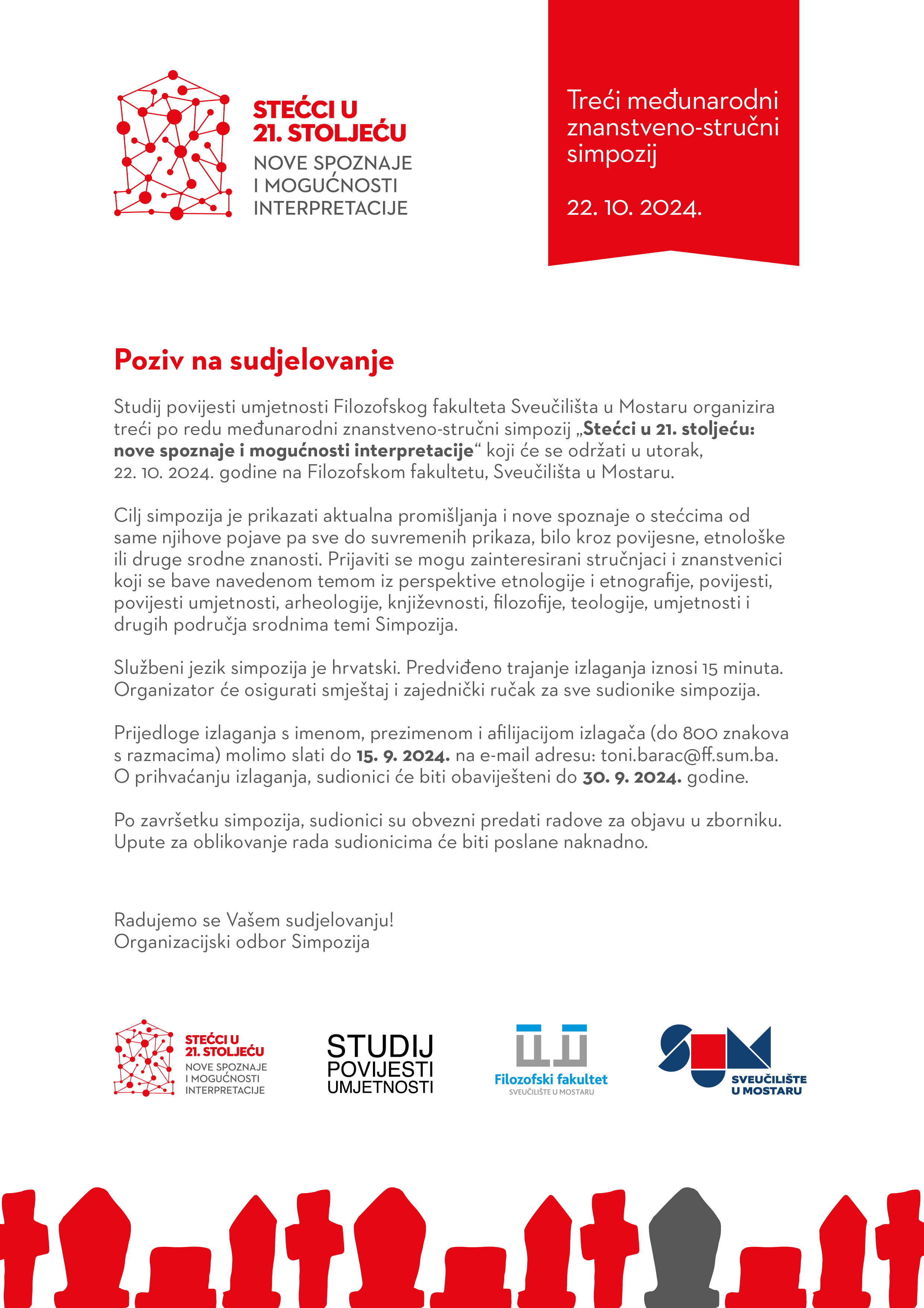 Studij povijesti umjetnosti Filozofskog fakulteta Sveučilišta u Mostaru organizira treći po redu međunarodni znanstveno-stručni simpozij „Stećci u 21. stoljeću: nove spoznaje i mogućnosti interpretacije“ koji će se održati u utorak, 22. 10. 2024. godine na Filozofskom fakultetu, Sveučilišta u Mostaru.