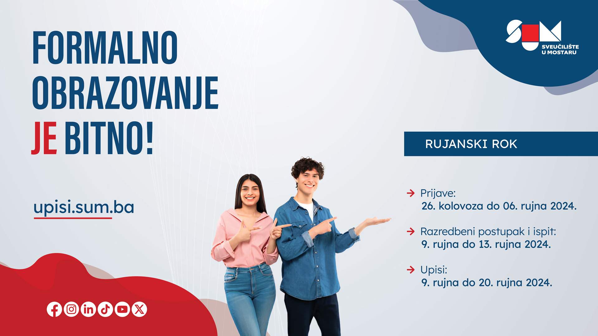 U tijeku su prijave za rujanski razredbeni postupak na Sveučilištu u Mostaru koje će biti otvorene do 6. rujna 2024. godine. Rujanski upisni rok donosi priliku za buduće studente koji su propustili ljetni upisni rok ili su se naknadno odlučili za studiranje na ovom Sveučilištu. S obzirom na raznolikost ponuđenih studija, studenti imaju mogućnost odabrati onaj koji najbolje odgovara njihovim interesima i karijernim ciljevima. Sveučilište u Mostaru, kao jedina visokoškolska ustanova u Bosni i Hercegovini koja održava nastavu na hrvatskom jeziku, okuplja oko 10.000 studenata na svojih jedanaest sastavnica te u dva Sveučilišna centra u Posavini i Srednjoj Bosni. Ovaj rujanski upisni rok posebno je zanimljiv jer privlači studente ne samo iz Bosne i Hercegovine, već i iz Hrvatske i drugih dijelova svijeta.