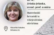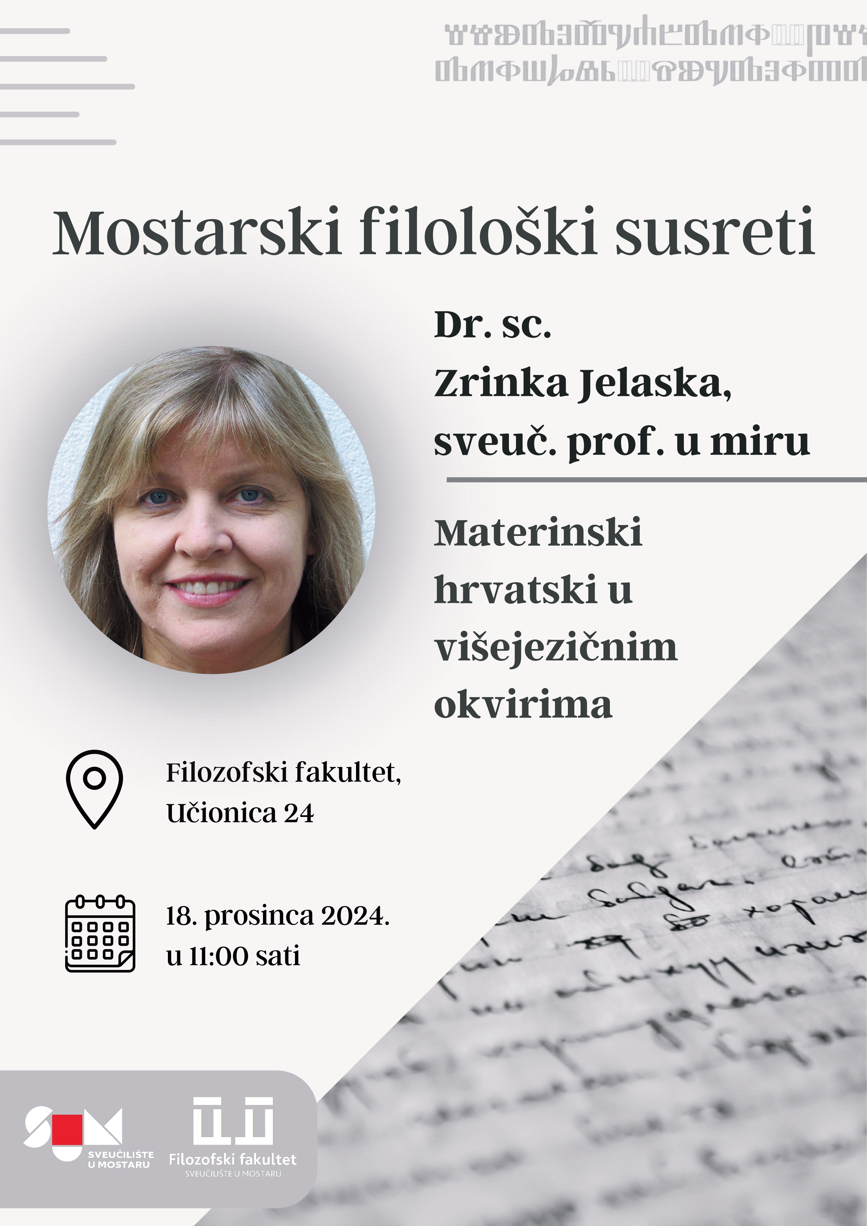 Na Filozofskom fakultetu Sveučilišta u Mostaru dr. sc. Zrinka Jelaska, sveuč. prof. u miru održat će predavanje na temu „Materinski hrvatski u višejezičnim okvirima“ 18. prosinca (srijeda) u učionici 24 u 11.00 sati.