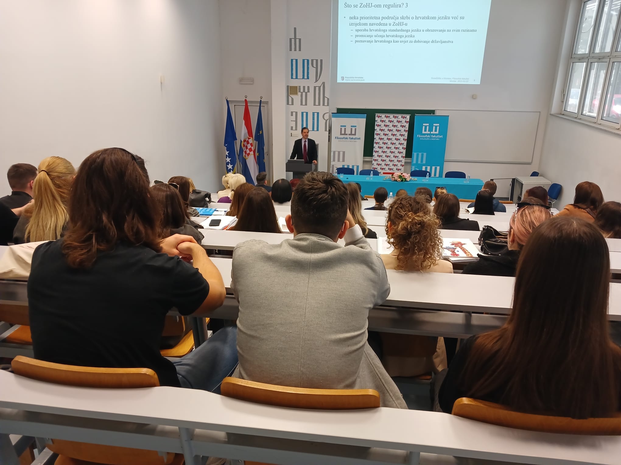 Na Filozofskom fakultetu Sveučilišta u Mostaru prof. dr. sc. Marko Tadić, predsjednik Vijeća za hrvatski jezik održao je predavanje na temu „Zakon o hrvatskom jeziku i Vijeće za hrvatski jezik u Republici Hrvatskoj: implikacije za hrvatski jezik u Bosni i Hercegovini“.