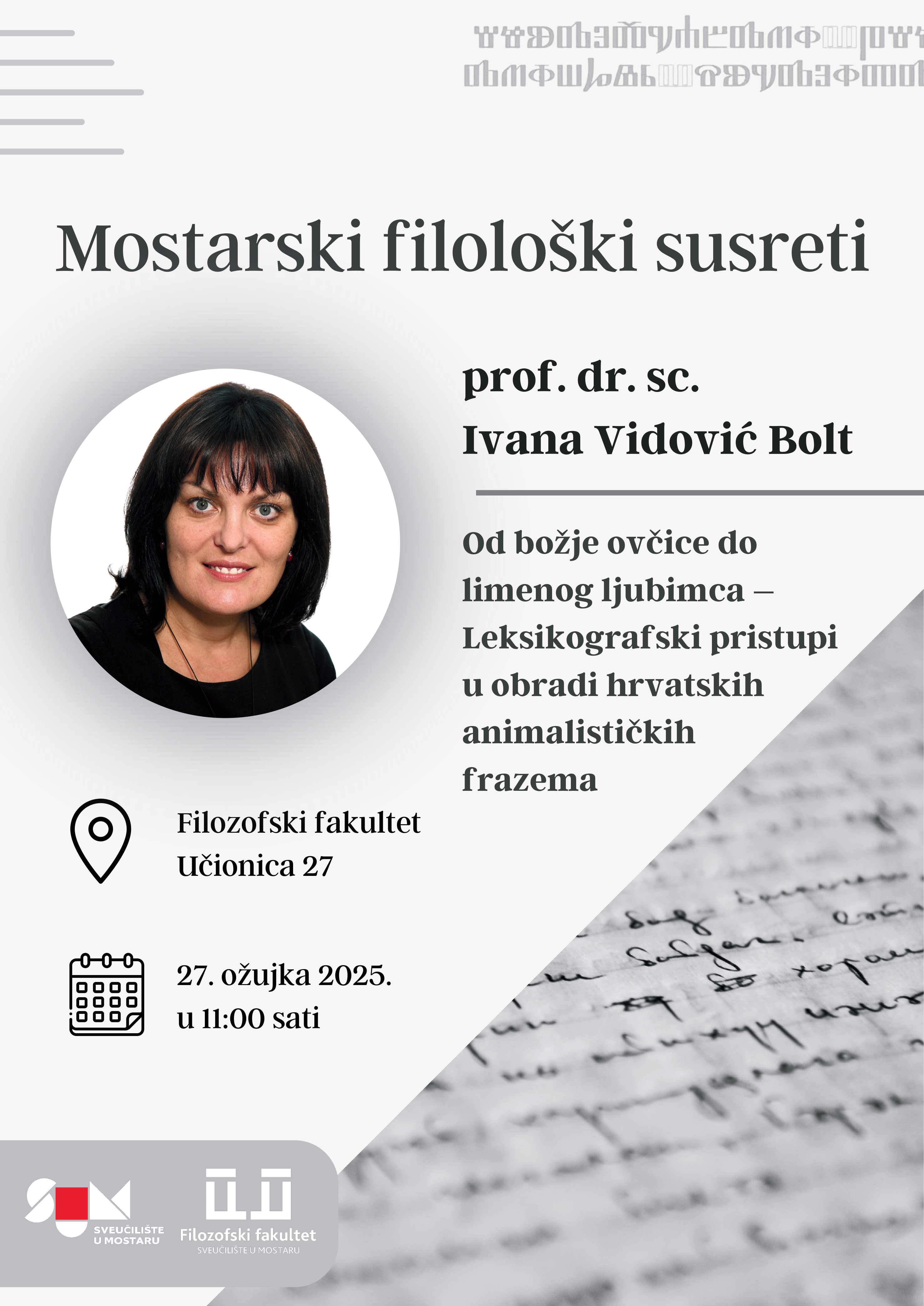 Na Filozofskom fakultetu Sveučilišta u Mostaru prof. dr. sc. Ivana Vidović Bolt održat će predavanje na temu „Od božje ovčice do limenog ljubimca – Leksikografski pristupi u obradi hrvatskih animalističkih frazema“ 27. ožujka u 11.00 sati u učionici 27.