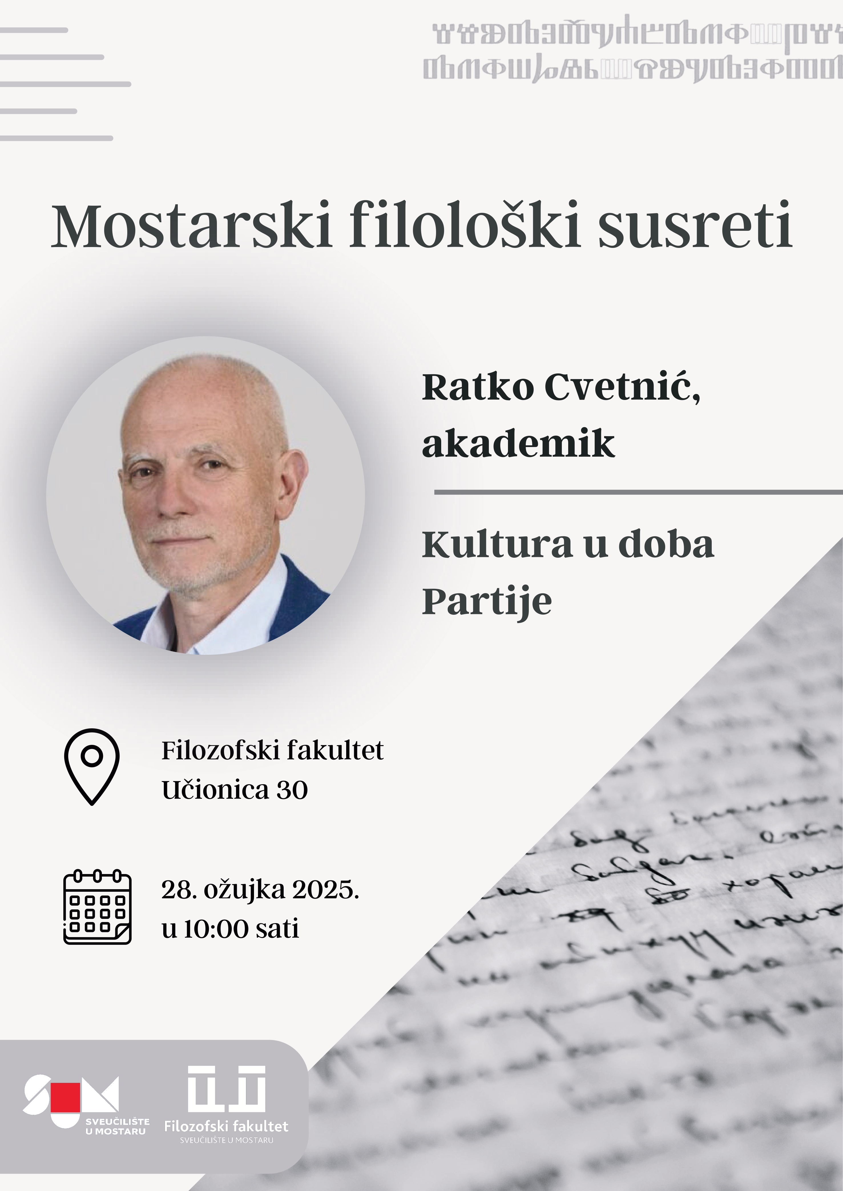 Predavanje je dio ciklusa predavanja koji se održavaju na Filozofskom fakultetu pod nazivom Mostarski filološki susreti.